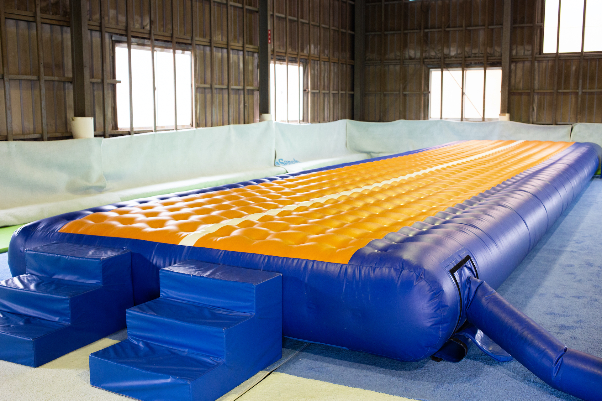転んでも痛くないので、前転・後転・ハンドスプリング、 バク転など色々な技に挑戦できます。また、トランポリンは運動効率が良いので、 はねるだけでも体幹を鍛えることができます。